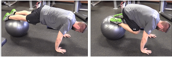 This is another great exercise that you'll love to strengthen the hip flexors. While using a stability ball, begin in a push up position with your knees on top of the ball. You're going to thoroughly engage both your core and arms. Next, you're going roll the ball very quickly in and then out, and repeat this movement several times.