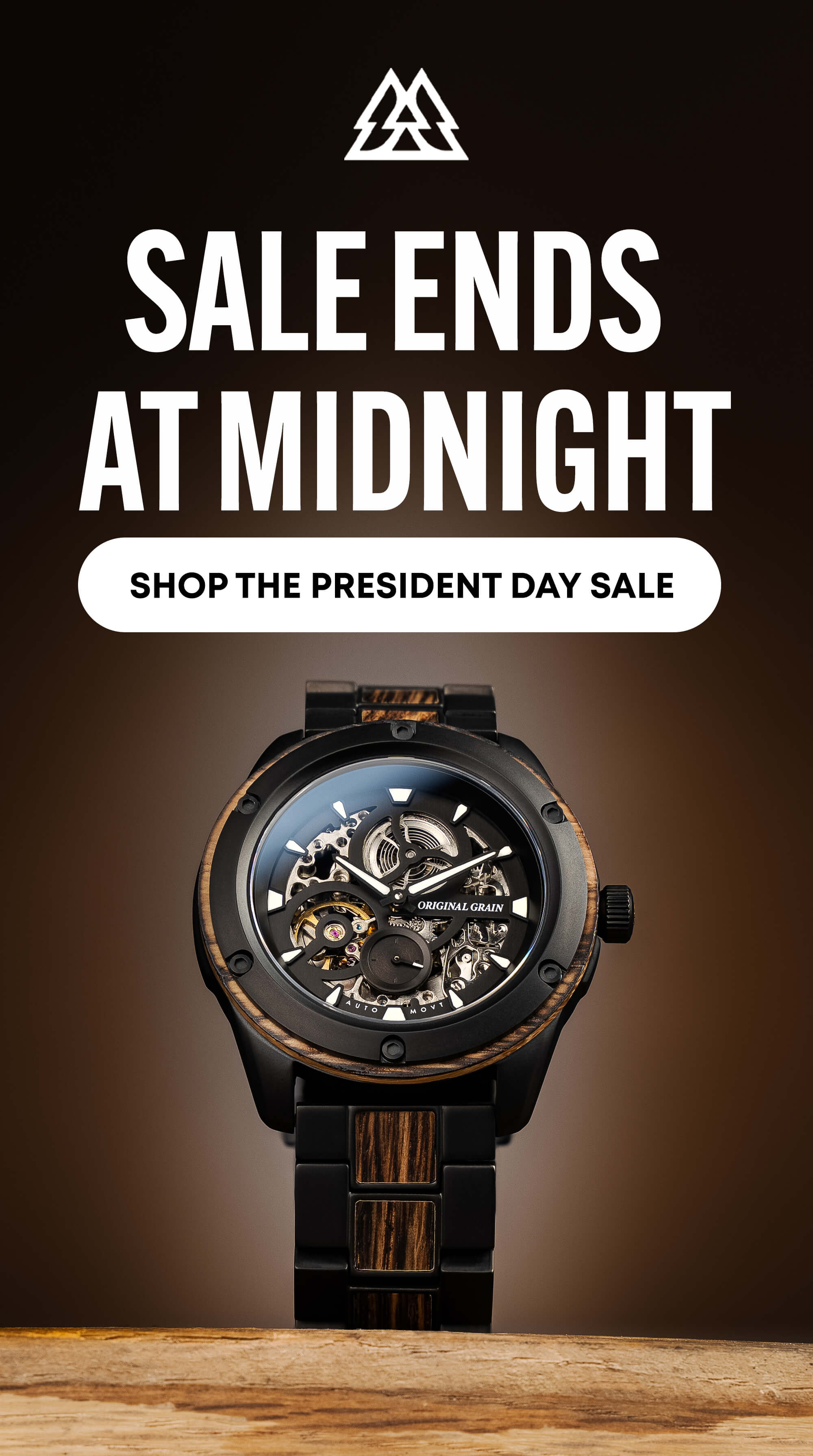 Hey! I'll make this quick.... Our President's Day sale ends at midnight and I didn't want you to miss it. If I'm being honest, one watch stands above the rest for me, the Whiskey Black Rugged Automatic 44mm. Charred oak whiskey barrel wood, ST1701 automatic movement, skeleton dial with sapphire crystal glass. It's the one I get stopped for most. Tonight only you can save 20% off and if you spend $500 or more and use code USA save an extra $50 off. Every watch includes a 1-year warranty, and we plant a tree with every order. Ryan Beltran, Co-Founder — Original Grain | | | | | |