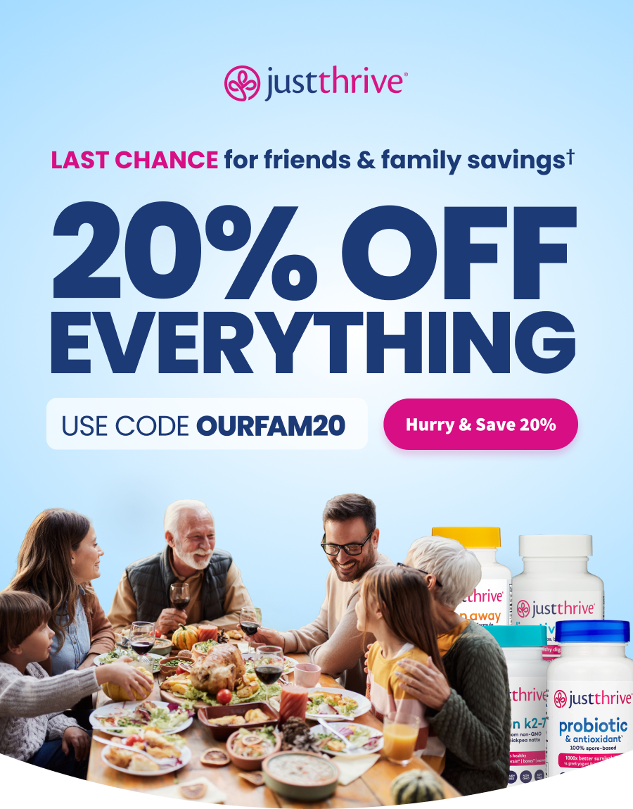 Save 20% On These Customer Faves | | Your Satisfaction, 100% Guaranteed If you don't absolutely love your purchase, you can request a full product refund at any time, no questions asked… Even if the bottle is empty! | | Just use code OURFAM20 at checkout. | | | | | | Free shipping on subscriptions | | Thousands of 5 star reviews | | | ︎ ✝︎ This promotion cannot be combined with other offers or applied to existing subscriptions. Discount only applies to one time orders and first subscription orders only. Future subscription renewals will be billed at the standard price. Must use code OURFAM20 at checkout. Free shipping applies to contiguous US orders only. Offer valid through March 20, 2025 at 11:59 PM CT. "Bottom of the Bottle" Guarantee: Not 100% satisfied with your Just Thrive purchase? Simply request a full product refund* - even if the bottle is empty! To qualify, product(s) must be purchased from JustThriveHealth.com. Maximum of two returns per product purchased. *Excludes return shipping costs. Update your email preferences here. No longer want to receive these emails? Unsubscribe. 810 Busse Highway, Park Ridge, IL, 60068 | | *These statements have not been evaluated by the Food and Drug Administration. These products are not intended to diagnose, treat, cure, or prevent any diseases. | | | | |